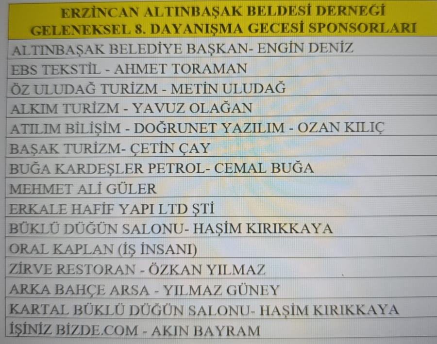 Kartal Belediye Başkanımız Sayın Gökhan YÜKSEL’e, Adalar Belediye Başkanımız Sayın Ali Ercan AKPOLAT’a, her Erzincan’dan bizler için gelen bizleri onurlandıran Altınbaşak Belediye Başkanımız Sayın Engin DENİZ’e, CHP İstanbul İl Başkan Yardımcımız Haydar KARASU, CHP Kartal İlçe Başkanımız Sayın Mert POLAT ve Yönetim Kuruluna, Kartal Belediye Başkan Yardımcılarımız Sayın Dr. Dilek KARS’a, Mustafa AĞDAŞ’a, Yasin ÜNDER’e, Olcay ÖZGÖN’e Kartal Belediye Meclis Başkan Vekilimiz Sayın Özlem BULUT’a, İBB CHP Meclis üyesi aynı zamanda Dernek Üyemiz Mimar Caner KILIÇ’a, Kartal Meclis üyelerimiz Fatmagül ALTINÖZ’e, Düzgün ÇAPAR’a, CHP Kartal Kadın Kolları Başkanı Sayın Özlem CENDERE DOĞAN ve Yönetim Kuruluna, Altınbaşak Belediye Encümen üyelerimiz Ahmet TAŞKIRAN ve Erol BAYIN’a, Üzümlü CHP İlçe Başkanı Yusuf GÖLER’e, Kartunsaş Genel Müdürü Yaşar TAN’a, Erzincan Konfederasyon Başkanı Erdal NAS’a, Altıntepe Mahalle Muhtarımız aynı zamanda Dernek üyemiz Halet ATAŞ’a, Büyük ada ve Burgaz ada Cemevi başkan ve yönetimine, İstanbul Ticaret Odası Mimarlar Meclis Üyesi Metin AĞIRMAN’a, Tanyeri Nahiyesi Derneği Başkanı Gökmen ÖZTOP, Yönetim Kurulu ve Kadın Kollarına, Türkiye Sakatlar Derneği Kartal Şube Başkanı Ayhan ALKAN’a, Avcılar Dernek Başkanı Erdal TOPAL ve Yönetim kurulu üyelerine, Kartal Çağdaş Edebiyat Sanat Derneği Başkanı Necmettin GÜLER’e, Erzincan24 Doğa ve Kültür Varlıklarını Koruma Derneği Başkanı Cemal ÇİÇEK ve Yönetim Kuruluna, Demirpınar Köyük Dernek Başkanı Celal KESER’e, Kartalımızın yerel basını Kaptan Haber’den Nuray YILMAZ’a, Günebakış Haber’den Suna ANAÇ’a, Değerli Sanatçı dostlarımız Kaya ASLANTEPE ve Ünal FIRAT’a, Davul Zurna’da Hüseyin YILDIRIM’a ve birbirinden kıymetli sevgili Altınbaşaklı Canlarımıza Dernek Yönetim Kurulu adına teşekkür ederiz.